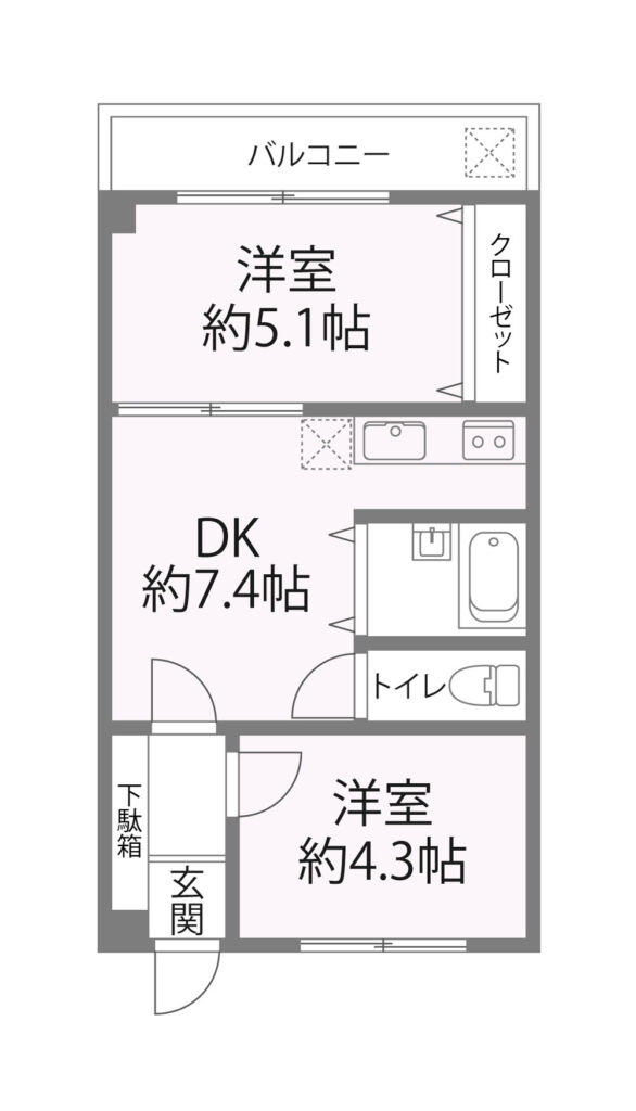 ‣専有面積:43.74㎡ ‣間取り:2DK