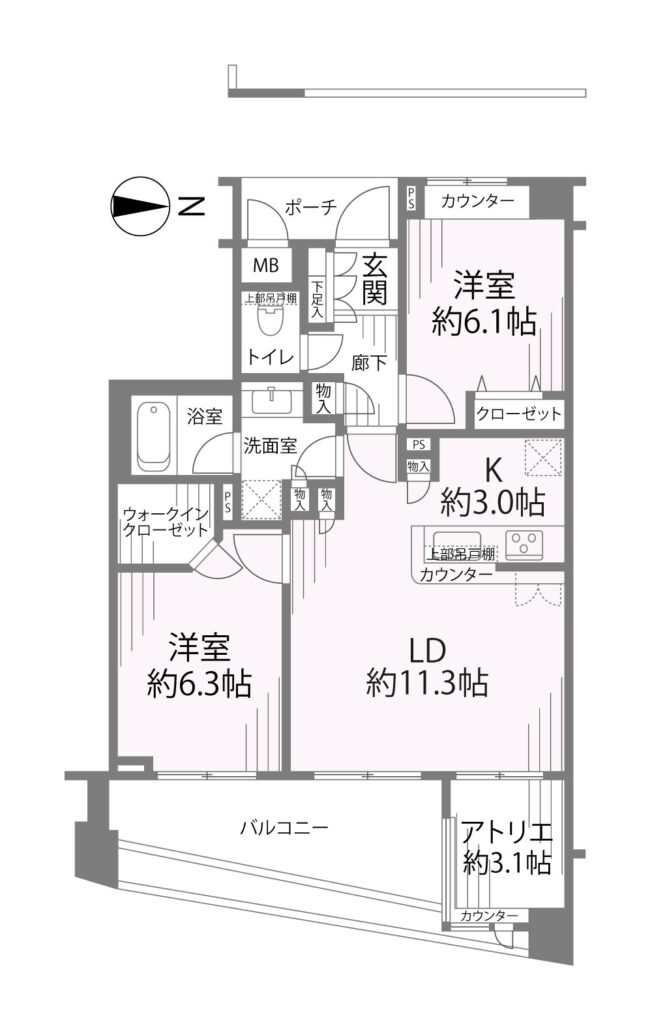 ‣専有面積:66.68㎡ ‣間取り:2LDK+アトリエ(約3.1帖)
