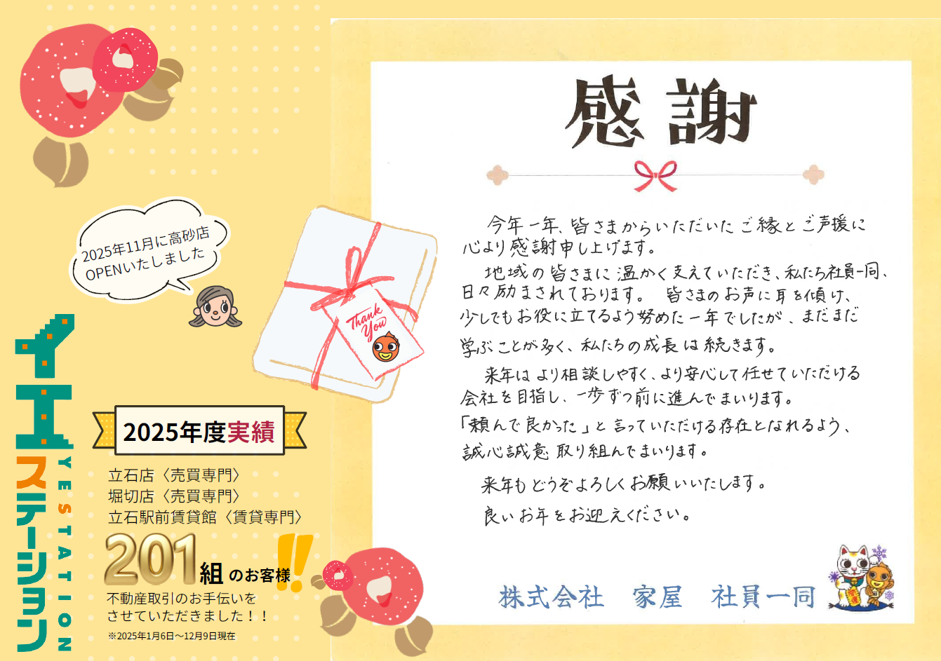 来年も皆さまの大切な住まい探し・不動産に関するご相談に誠心誠意お応えしてまいります。
